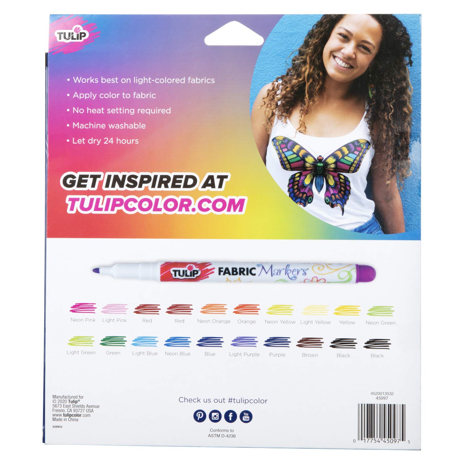 - VIBRANT COLOR: Premium, highly pigmented inks dry with a bold, colorful finish on light fabrics and other craft surfaces. Pack features 20 vibrant Fabric Markers in a must-have rainbow palette including: neon pink, light pink, 2 reds, neon orange, orange, neon yellow, light yellow, yellow, neon green, light green, green, light blue, neon blue, blue, light purple, purple, brown, and 2 blacks