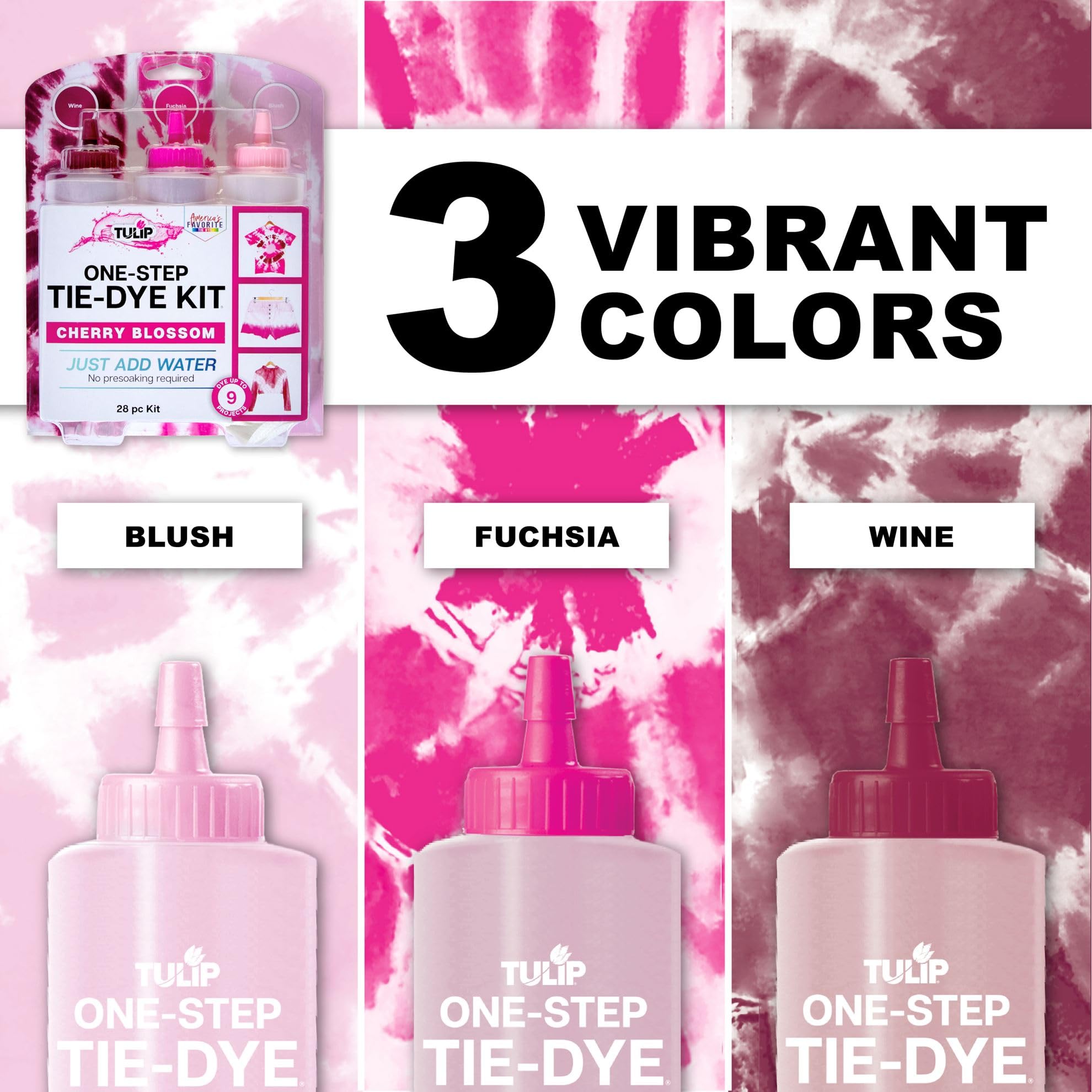Tulip One-Step Tie-Dye 3 Color Kit, Easy Techniques, Vibrant & Permanent Fabric Designs Tie Dye, Cherry Blossom Colors: Wine, Fuchsia, Blush Pink