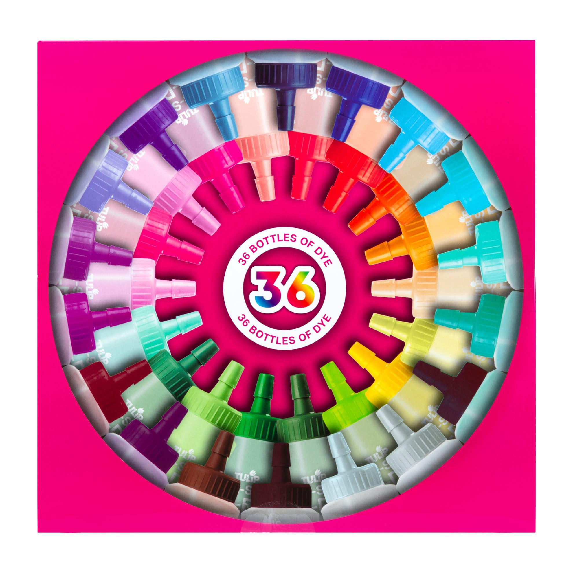 - ULTIMATE TIE DYE KIT FOR GROUPS — Everything you need in one box: 36 prefilled full-size (2.75 fl. oz.) bottles of fabric dye in 36 vibrant colors, 20 gloves, 120 rubber bands, and 3 project guides. Perfect for parties, summer camps, family reunions, and group activities.