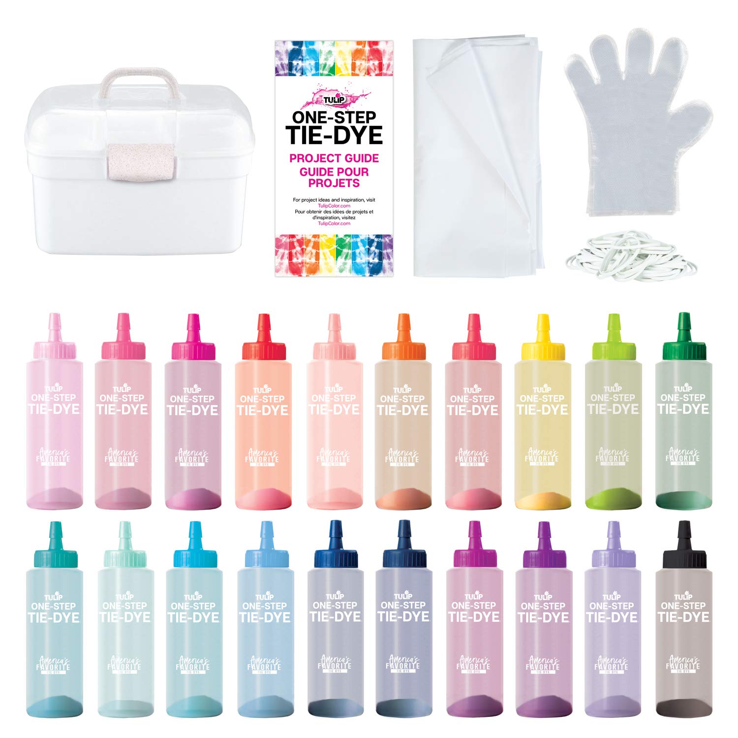Tulip One-Step Tie-Dye Color Spectrum Tub, 24 Bottles, Rainbow Colors, All-in-One Tie Dye Kit for Large Groups, Permanent on Fabric, Pre-Filled Bottles, Gloves, Instructions
