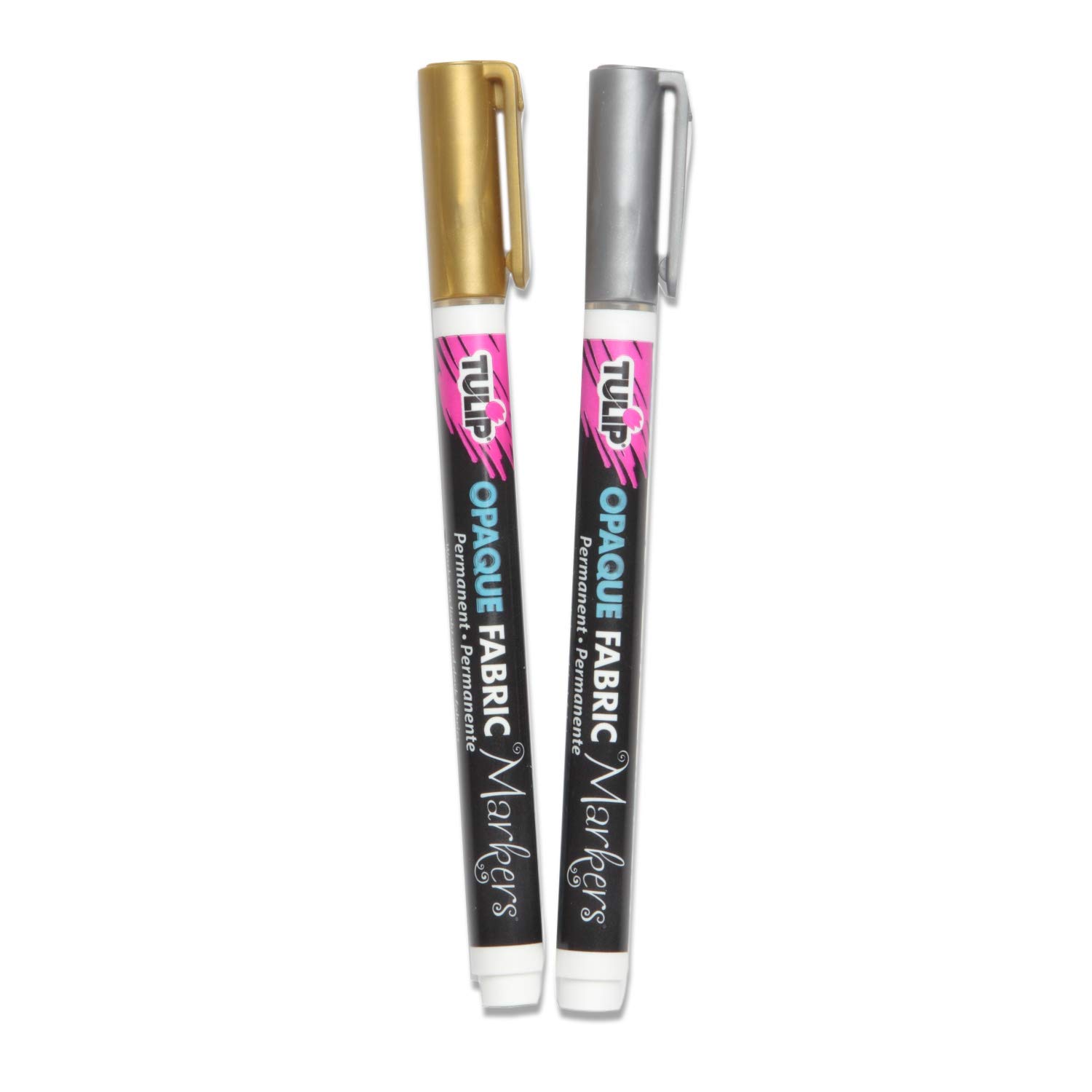 - Metallic Fabric Markers 2-pack includes gold and silver bullet tip markers